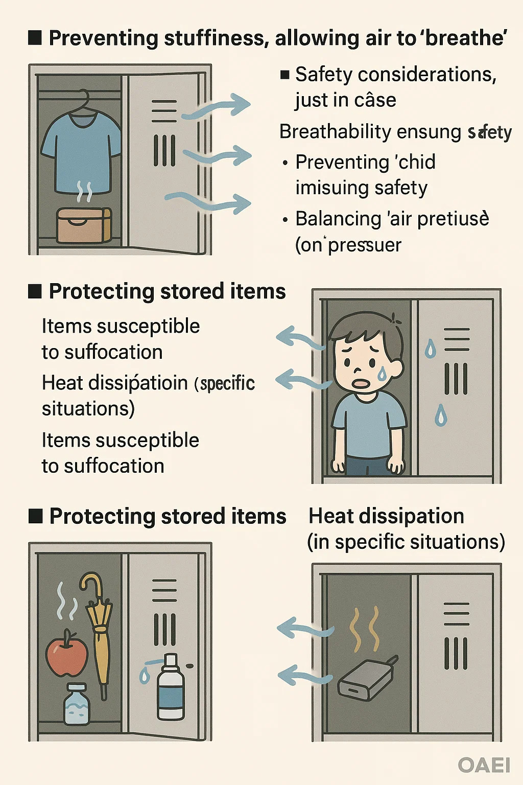 Breathability memastikan keselamatan (salah satu sebab yang paling penting): ini penting! Sekiranya kanak -kanak salah laku atau tidak sengaja mengunci diri di dalam loker (walaupun jarang, ini adalah pertimbangan reka bentuk), lubang -lubang kecil ini memastikan aliran udara dan mencegah lemas. Ruang yang dimeteraikan tanpa lubang sangat berbahaya.